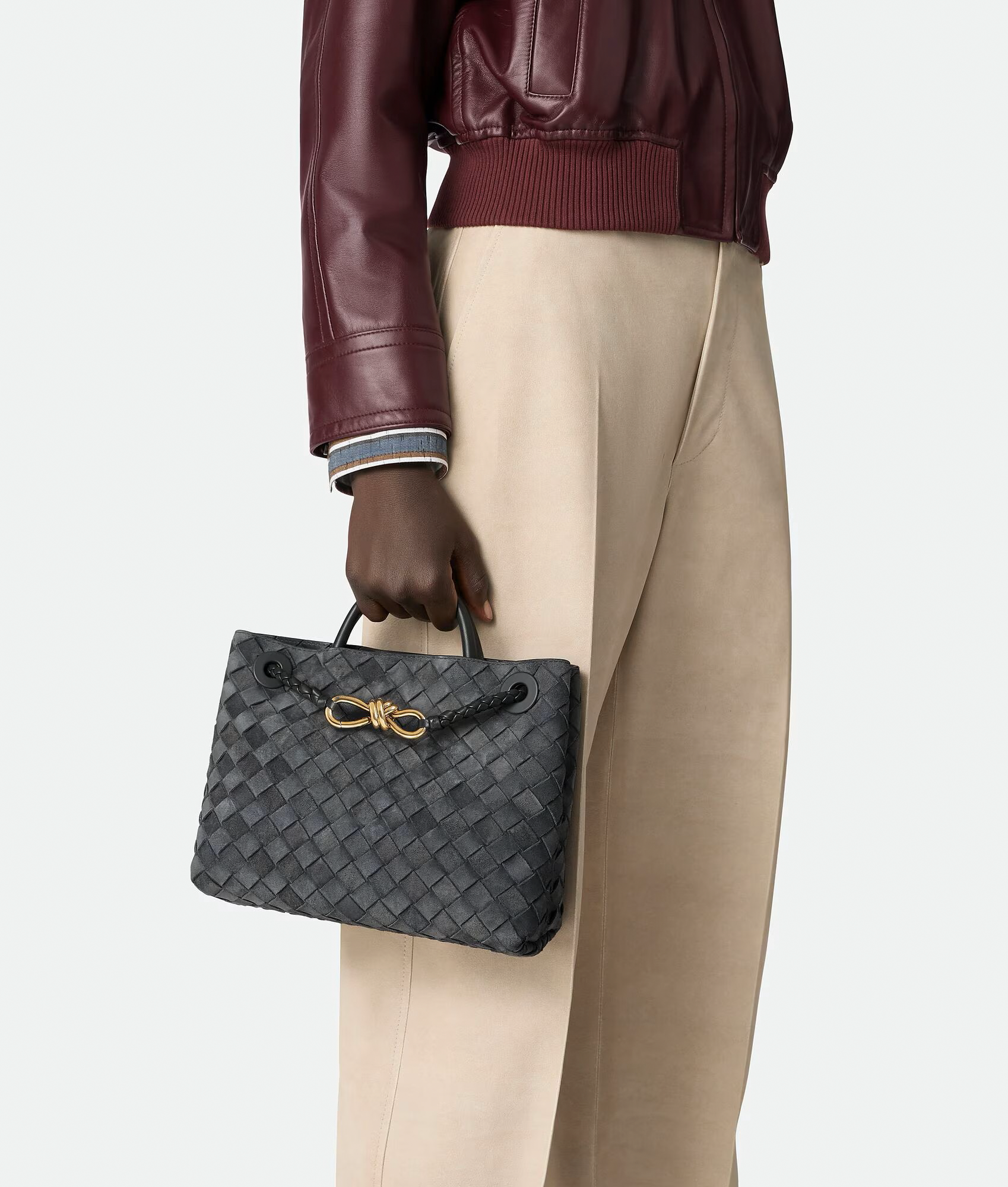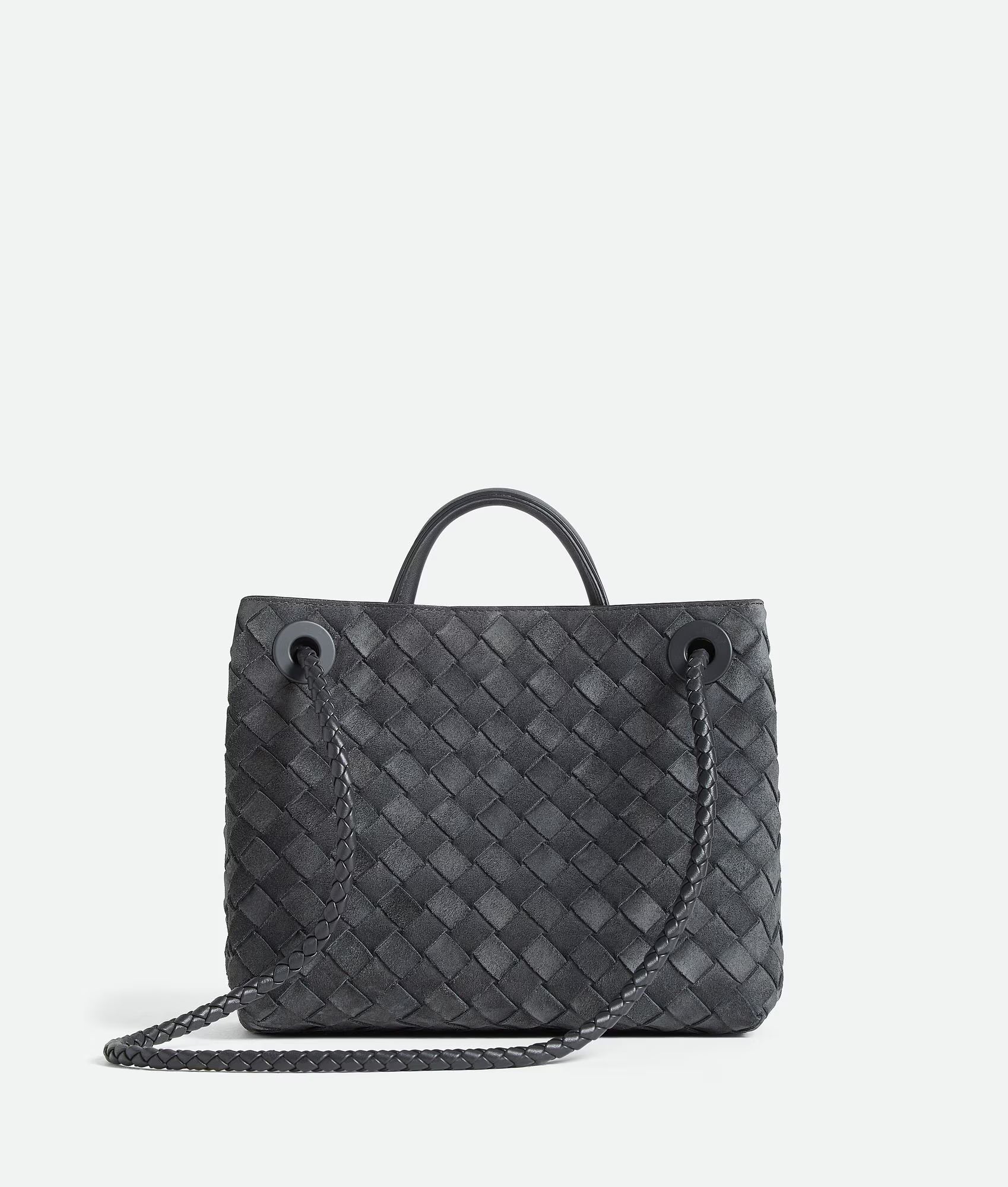 Чанта с къса дръжка от мека алкантара кожа Intrecciato с емблематичен възел и плъзгаща се презрамка за носене през рамо.